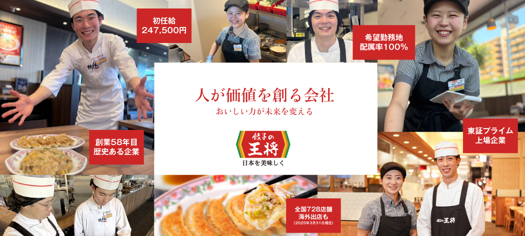 王将ではマニュアルに沿って作るので、入社してすぐに調理をスタートできます。 また研修も充実しているため、「一人前になるまで何年も…」なんて心配はいりません! オープンキッチンでお客様の笑顔を見ながら調理できるライブ感も魅力。 さらに、お店ごとのオリジナルメニューを考えるチャンスも! あなたのアイデアが新メニューになるかも!?