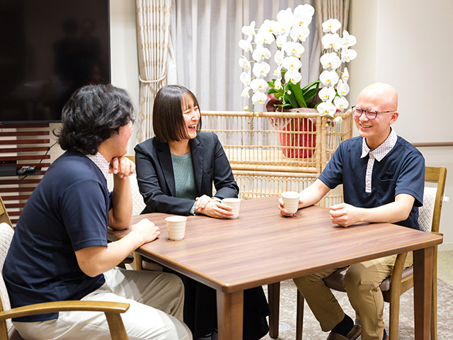 入社後の試用期間3カ月間は先輩がとなりにつくので、「入浴介助のタイミングが分からない」「タブレットでの記録ってどうやるんだろう」など、どんな小さなことでもすぐに相談できます。先輩後輩の壁がなく、フラットな社風のおかげで不要なプレッシャーなども感じず、とっても働きやすい環境で仕事ができます。