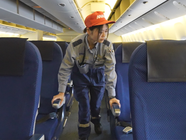 航空機が到着しお客様が降機されたあと、次の出発に向けて機内を正確かつ迅速に清掃します。限られた時間でスムーズに作業を進めるためにはチームワークが大切なので、仲間との声掛けを心がけています。