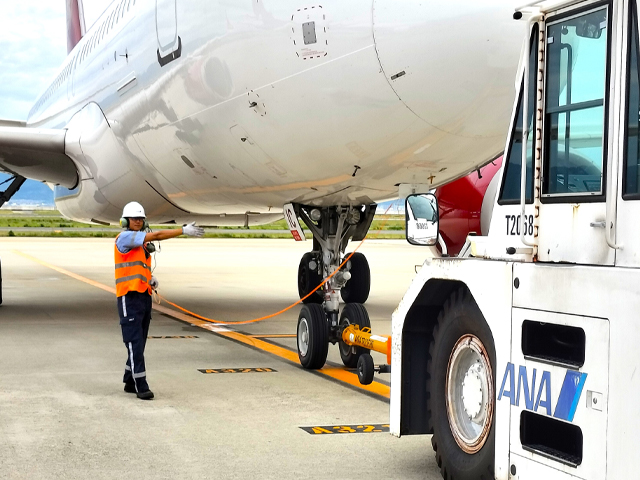 航空機トーイングカーを用いて、航空機をスポットから自走できるところまで押し出します(プッシュバック)