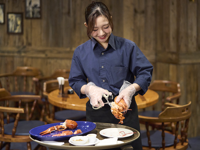キッチンではロブスターを中心に、肉・魚・パスタ・サラダなど多彩な料理を担当します。入社時に調理経験がなくても、包丁の持ち方から丁寧に教える体制が整っているため安心。毎日の積み重ねで自然とスキルが身につき、「できることが増えていく実感」を得られます。調理師免許の取得補助もあり、将来につながる技術を学びながら成長できる環境です。