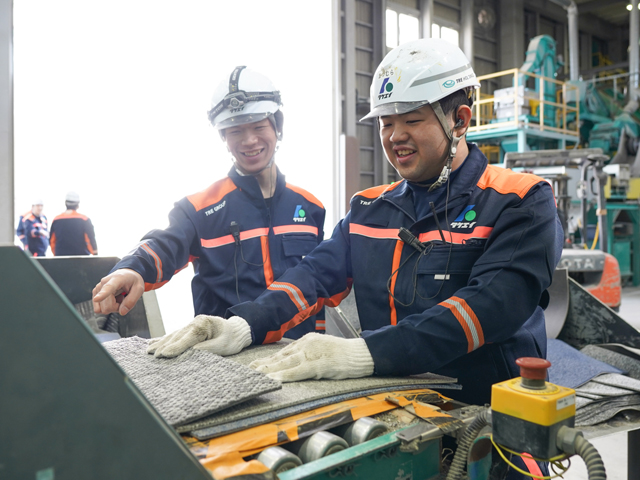 特に誇るのが、業界内でも珍しい「タイルカーペット」の再生技術。通常は埋め立てられる素材を、東京リサイクルセンターでは再資源化し再び製品の原料へと生まれ変わらせます。また、工場内のダストを圧縮してつくる「エコフォーム」は、製鉄メーカーで欠かせない資材として重宝されており、廃棄物由来でこれをつくれるのはタケエイの強み。資源循環を支える重要な役割を担っています。